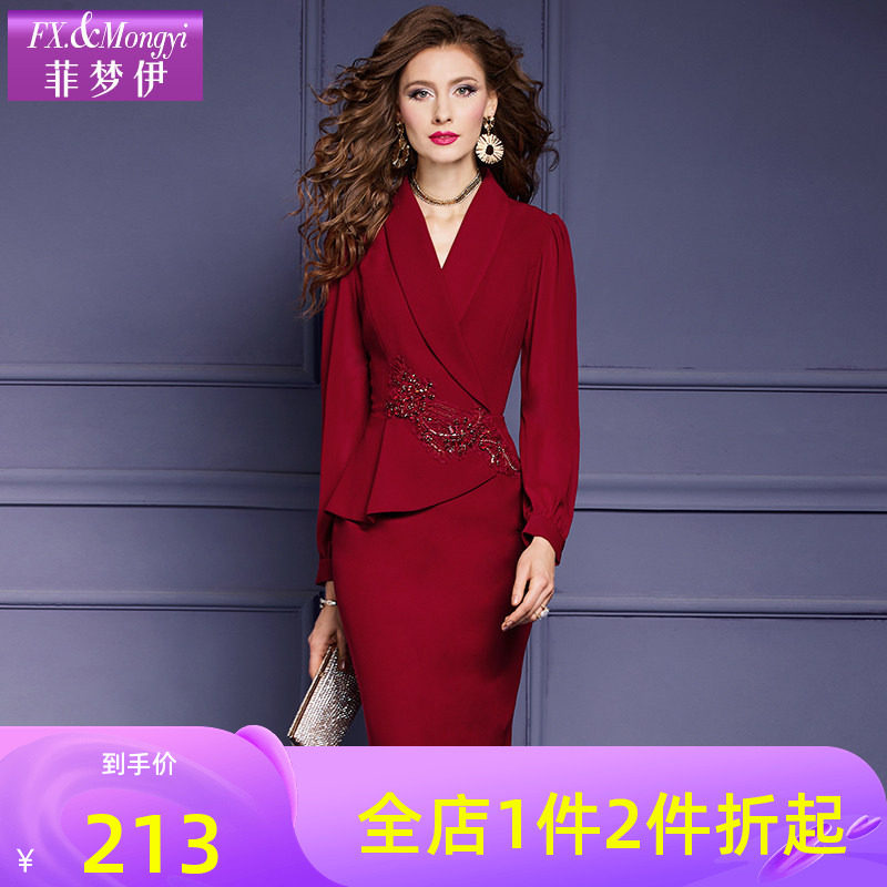 菲梦伊红色西装连衣裙女长袖秋季时尚通勤气质干练钉珠职业工作服