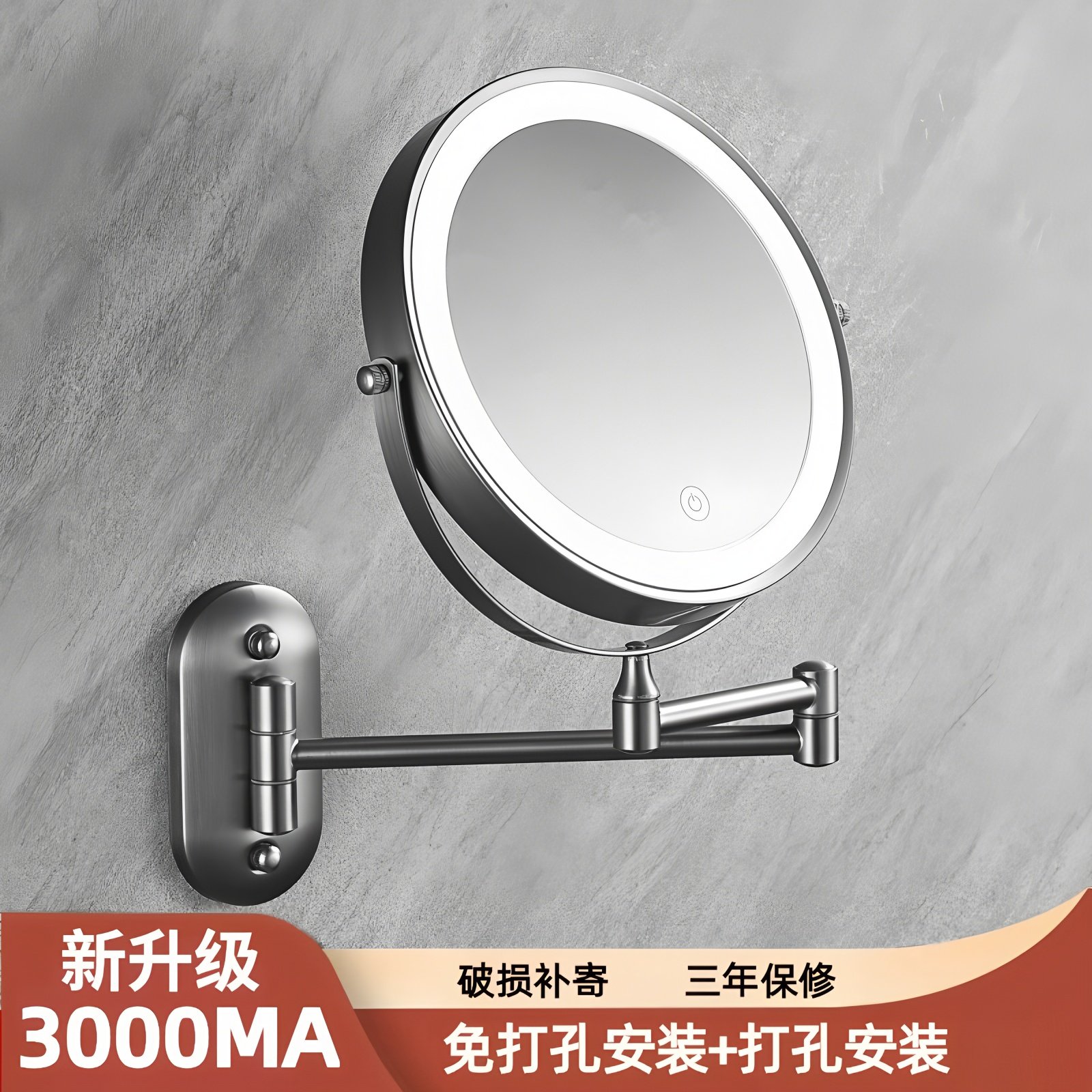 LED免打孔浴室折叠美容镜三色灯 银色双面化妆镜伸缩放大镜子壁挂