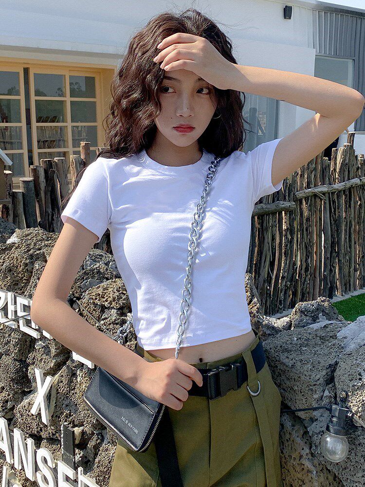 纯欲风白色圆领高腰短袖t恤女夏季新款韩版修身显瘦收腰上衣体恤