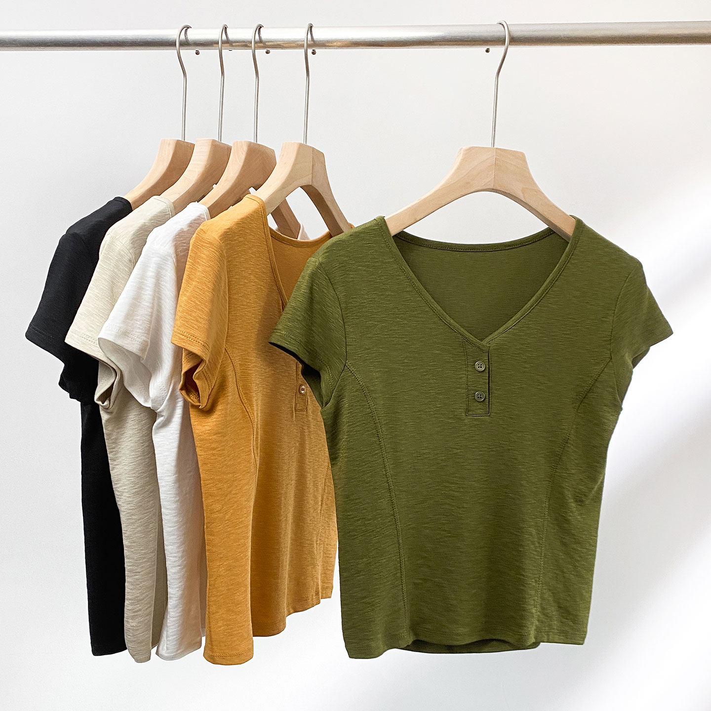 极简风V领短袖T恤女短款2026夏季纽扣修身百搭正肩上衣高腰体恤