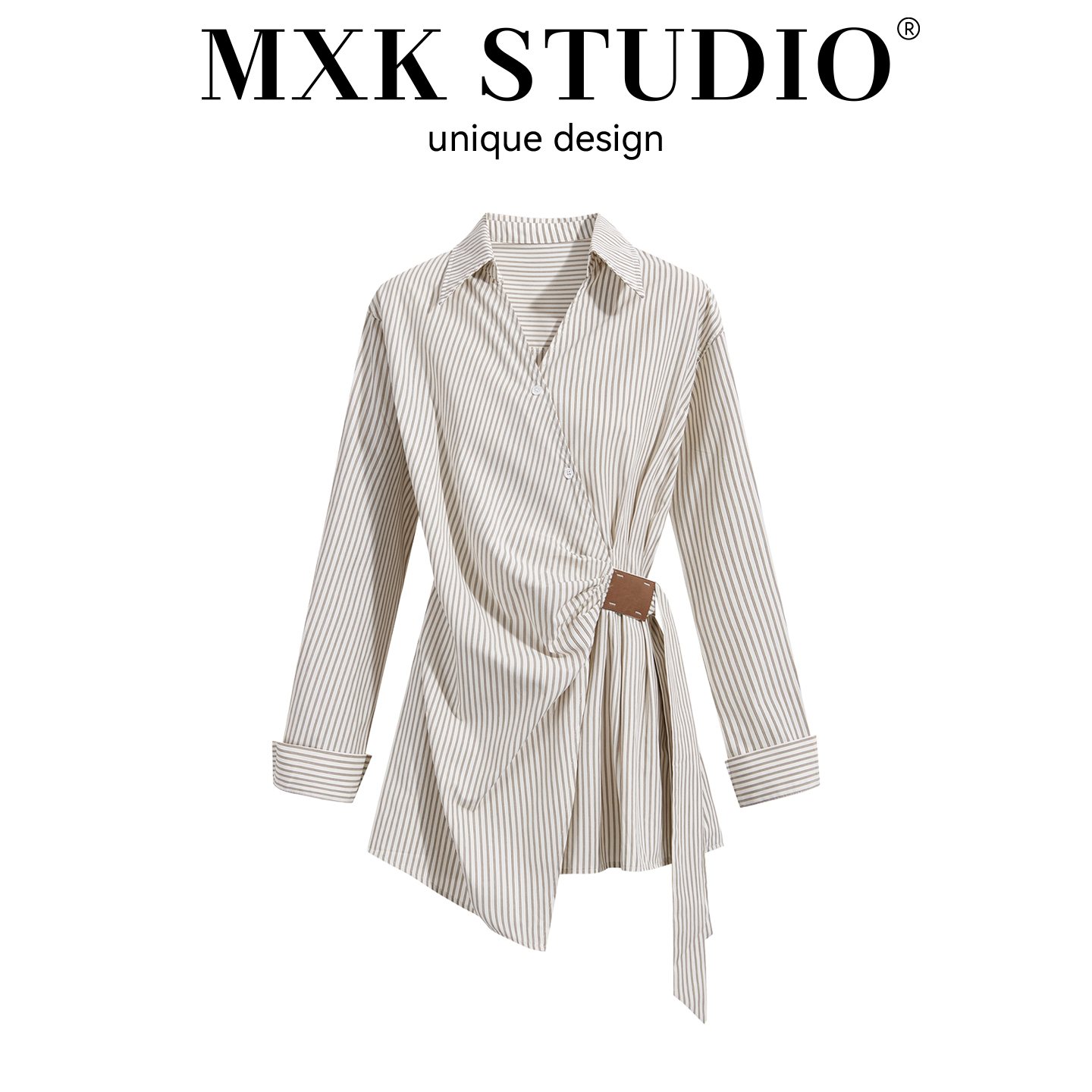 dorydory 米白色条纹翻领不规则收腰衬衫女斜门襟腰封长袖上衣秋