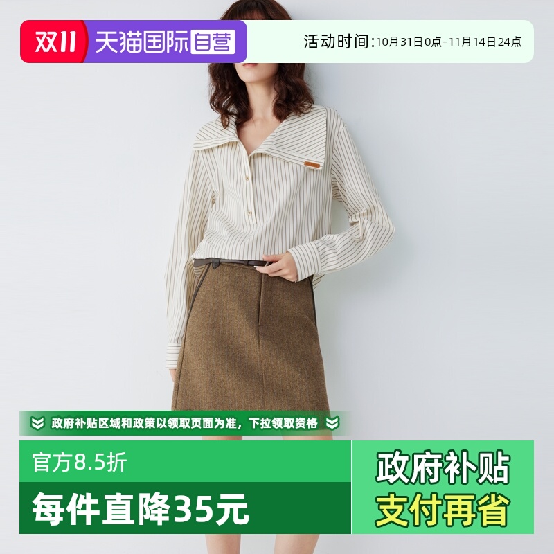 【自营】ELLE咖色条纹肌理感不规则翻领衬衫女2025秋新款小众衬衣