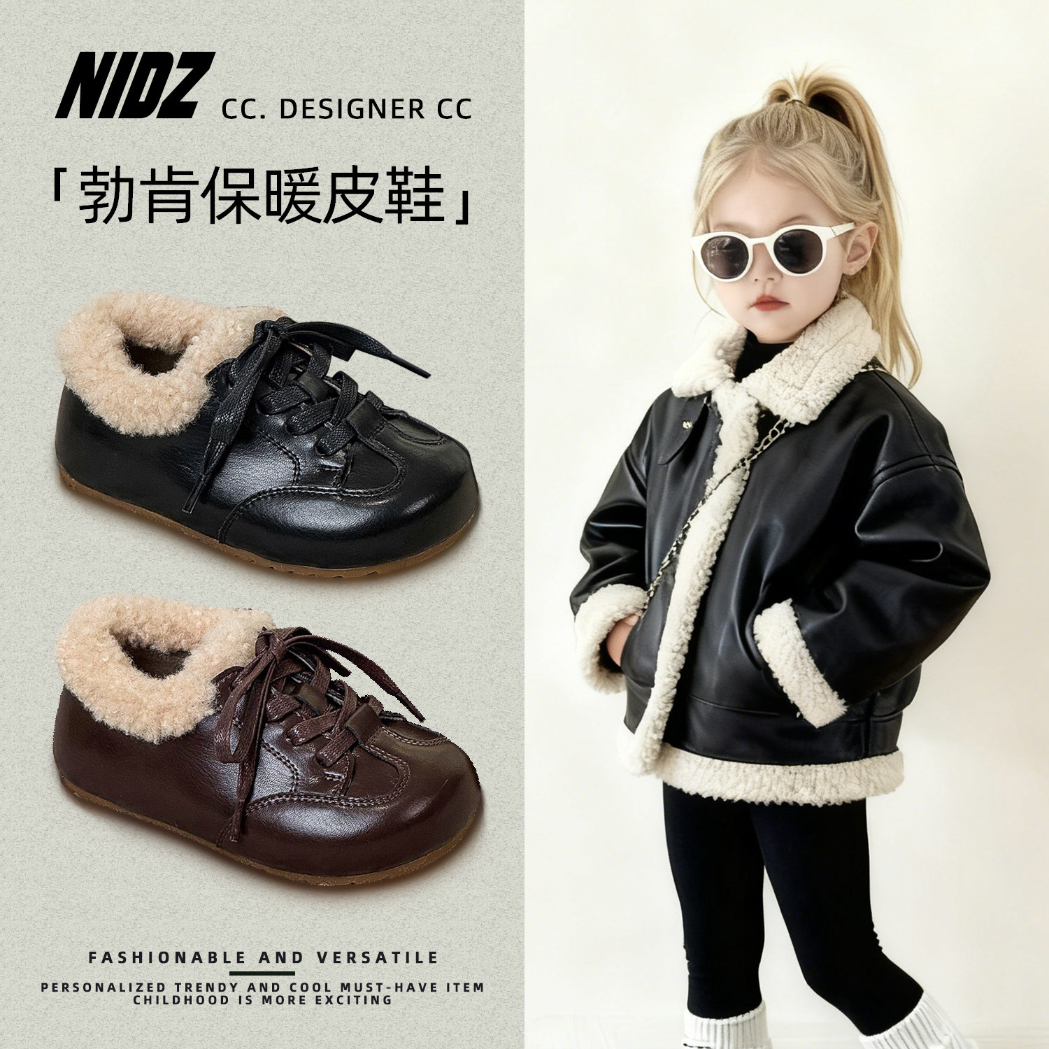 NIDZ韩版儿童棉鞋冬季加绒保暖女童勃肯豆豆鞋复古羊羔毛宝宝皮鞋