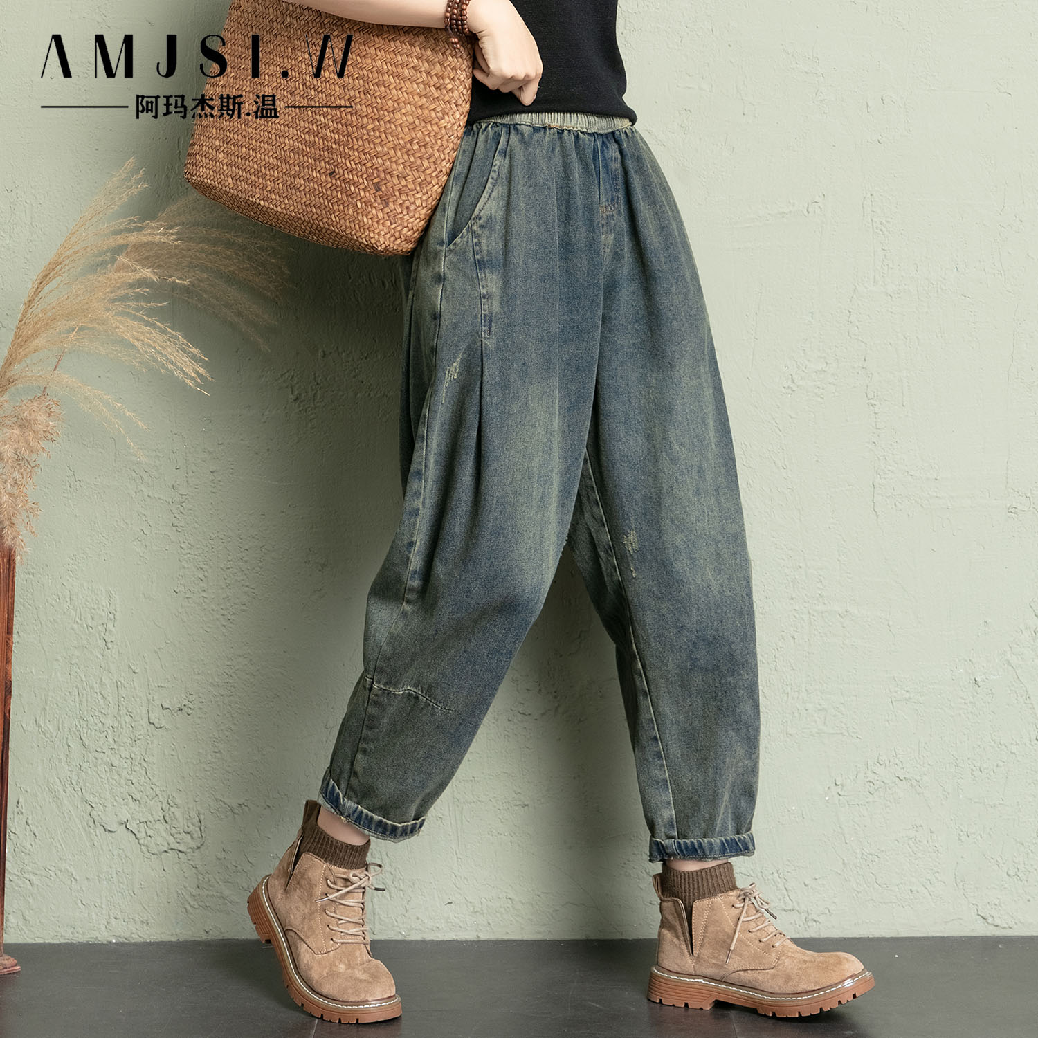 古与色秋季韩版港味水洗松紧高腰宽松休闲长裤百搭牛仔裤哈伦裤女