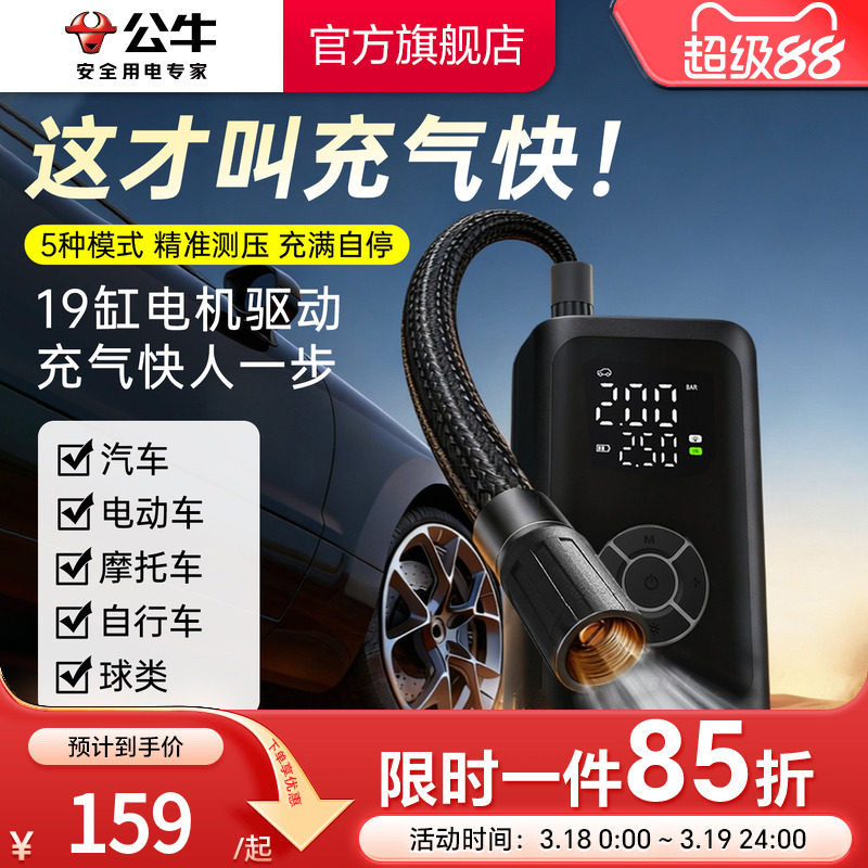 公牛车载充气泵电动打气筒打气泵汽车用测轮胎压电动车无线充气宝