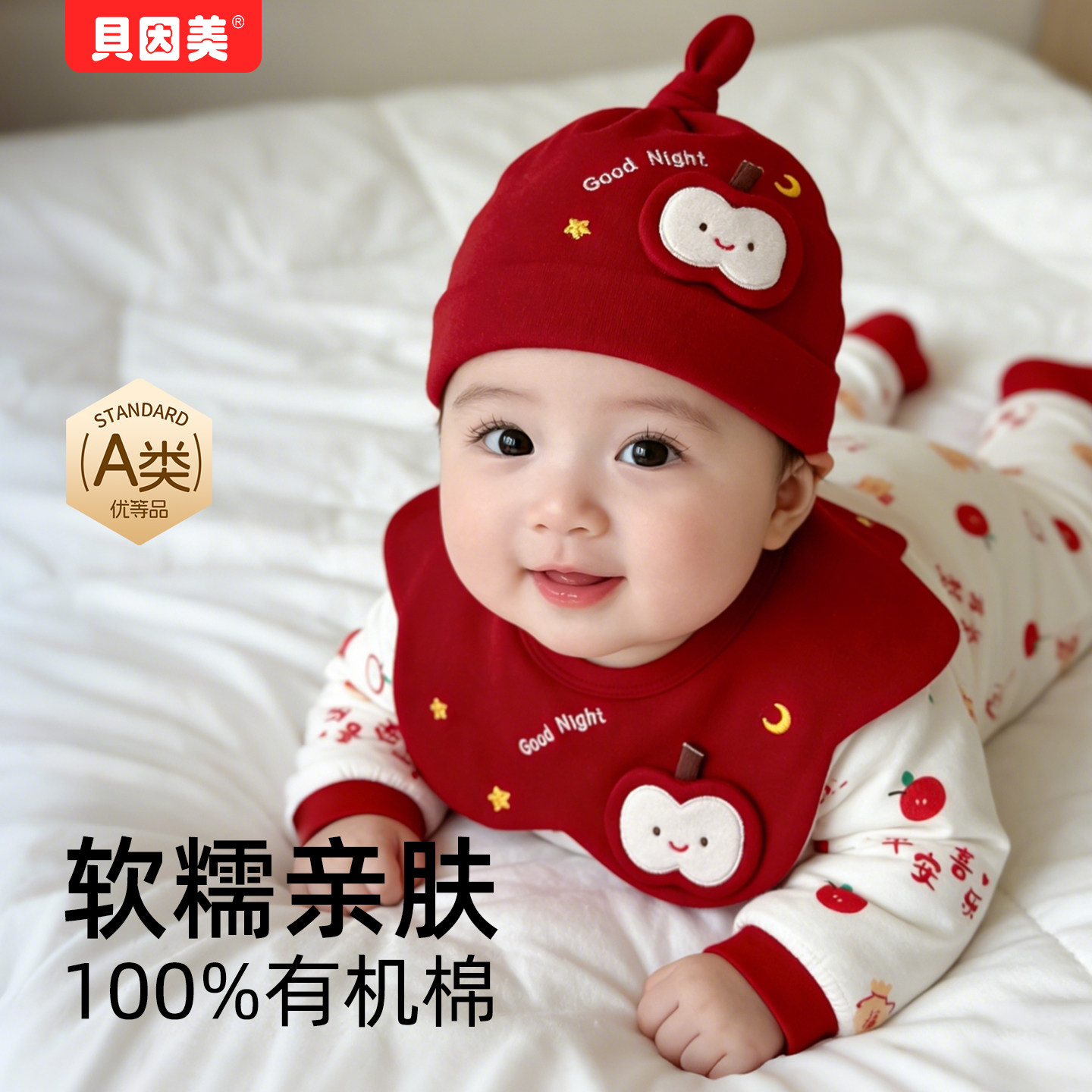 贝因美新生儿胎帽春秋冬纯棉小月龄宝宝帽子婴儿红色百天过年满月