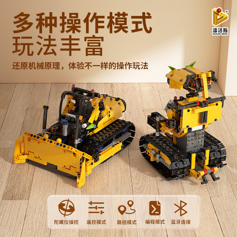 潘洛斯675003拼装科技电动APP遥控智能机器人推土机积木模型玩具