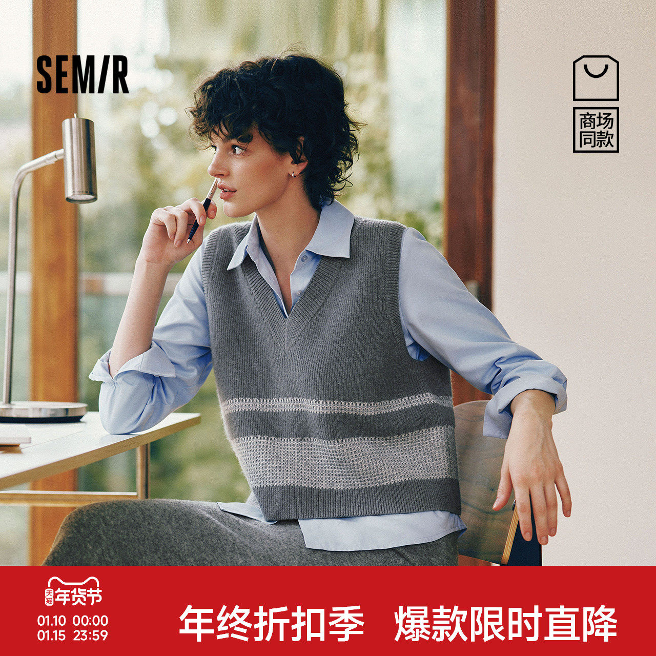 商场同款|森马长袖衬衫女冬条纹V领短背心磨毛衬衣2025新款两件套