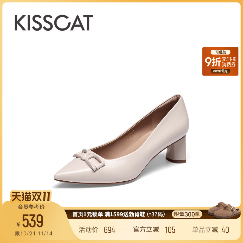 KISSCAT接吻猫新款通勤粗跟浅口单鞋高级尖头真皮黑色高跟鞋女