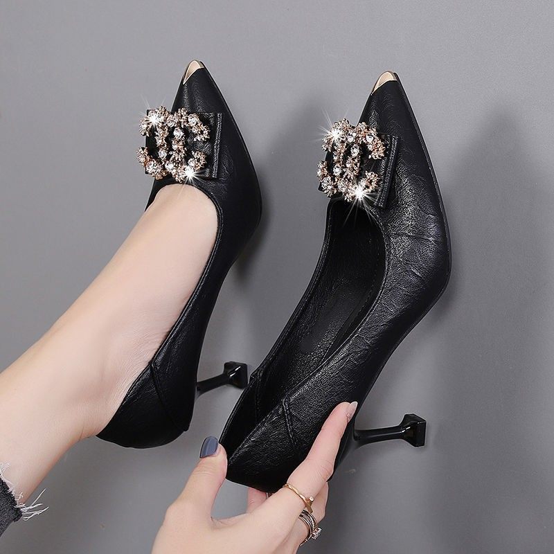 真皮黑色高跟鞋女新款气质职业上班大码女鞋水钻法式细跟尖头单鞋