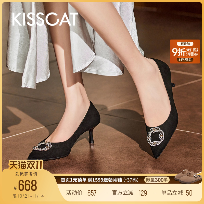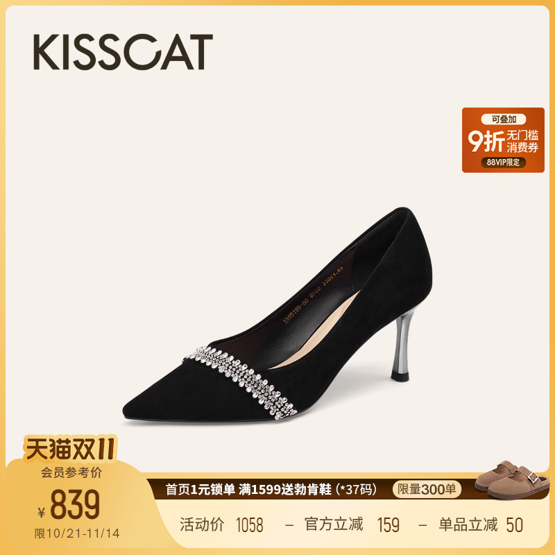 KISSCAT接吻猫[繁花系列]水钻婚鞋尖头浅口单鞋真皮黑色高跟鞋女