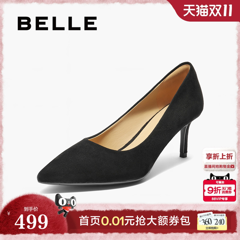 百丽通勤细跟黑色高跟鞋女款上班婚鞋真皮上班穿单鞋子A5T1DAQ4