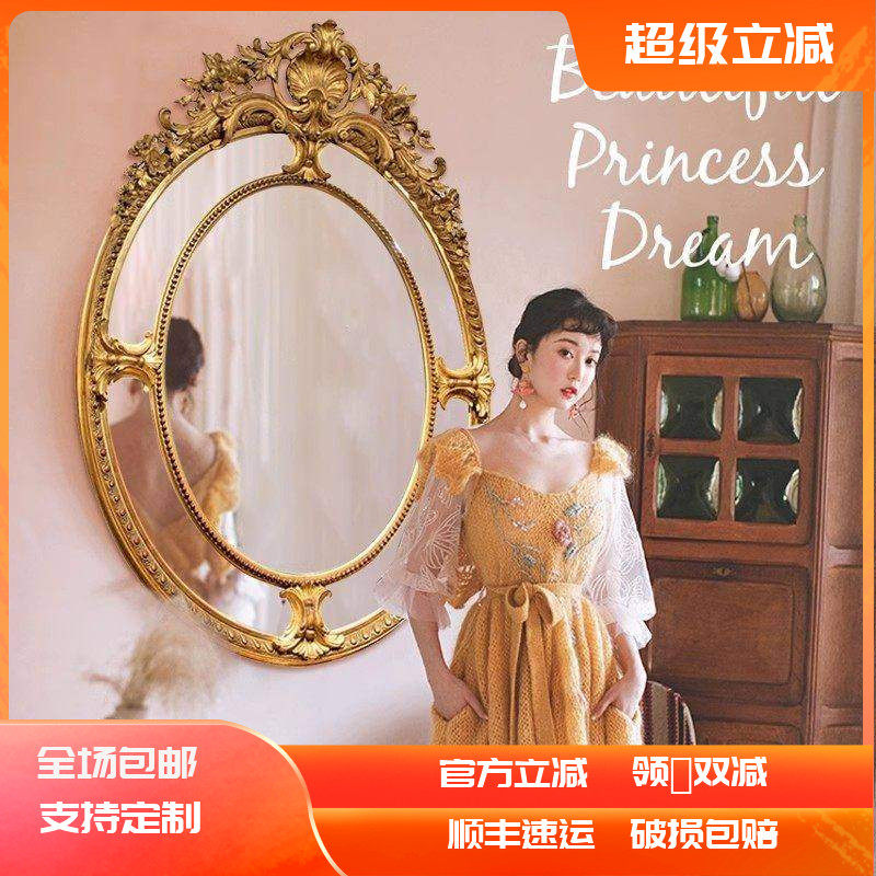 复古金色化妆镜雕花壁挂装饰镜法式梳妆镜子树脂卧室挂墙壁饰镜子