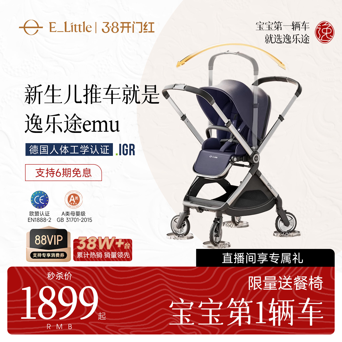 逸乐途emu/pro双向婴儿推车新生儿轻便高景观可坐可躺宝宝遛娃车
