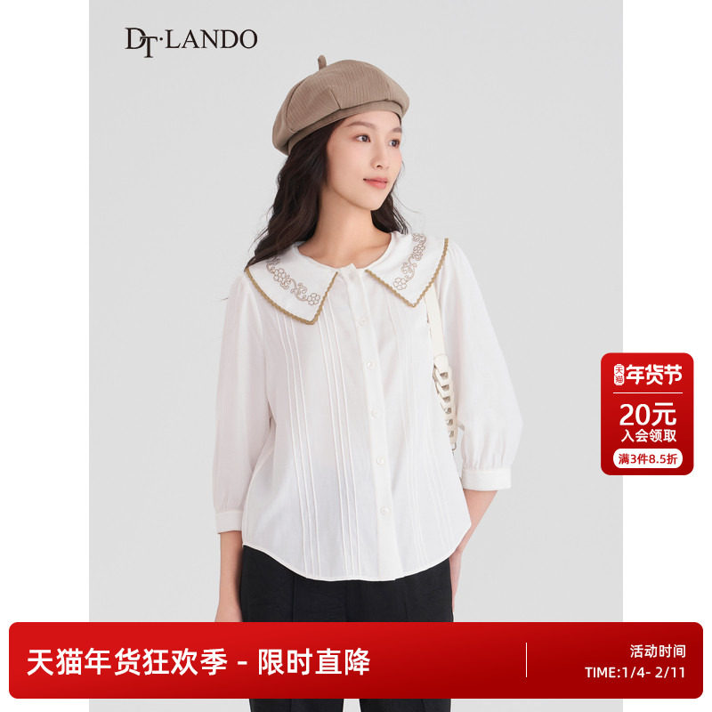 名师路撞边娃娃领七分袖直筒白色衬衫女上衣2025秋季新款薄显瘦