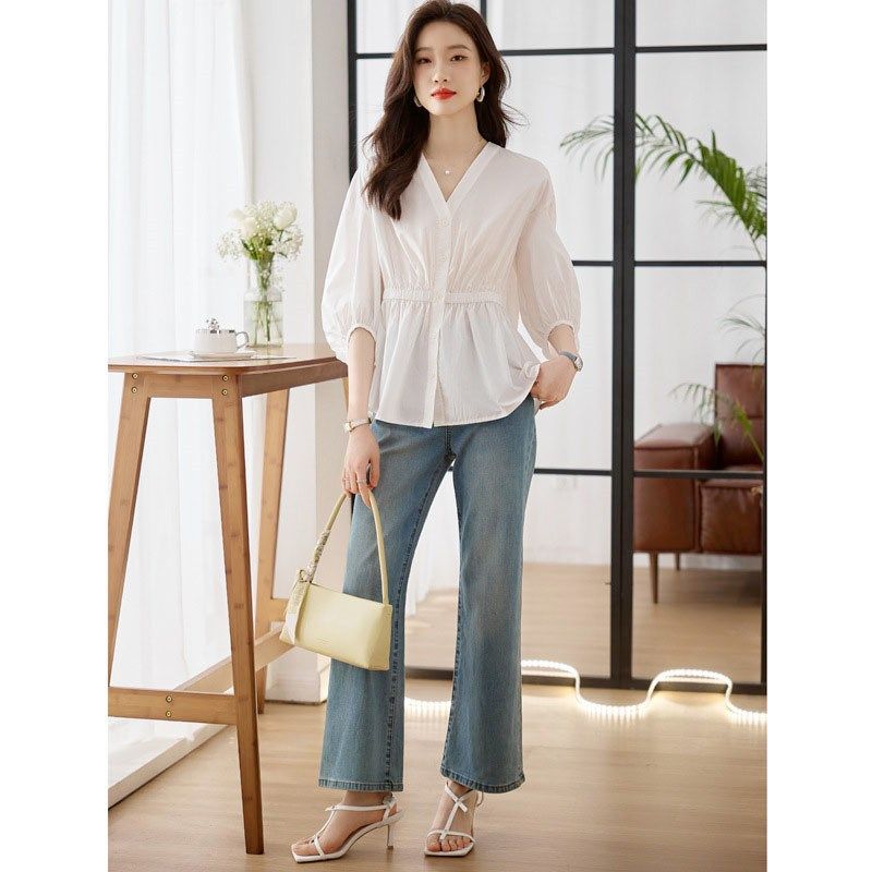 衬衫上衣女装2024新款夏款收腰V领娃娃衫秋七分袖短袖衬衣雪纺衫