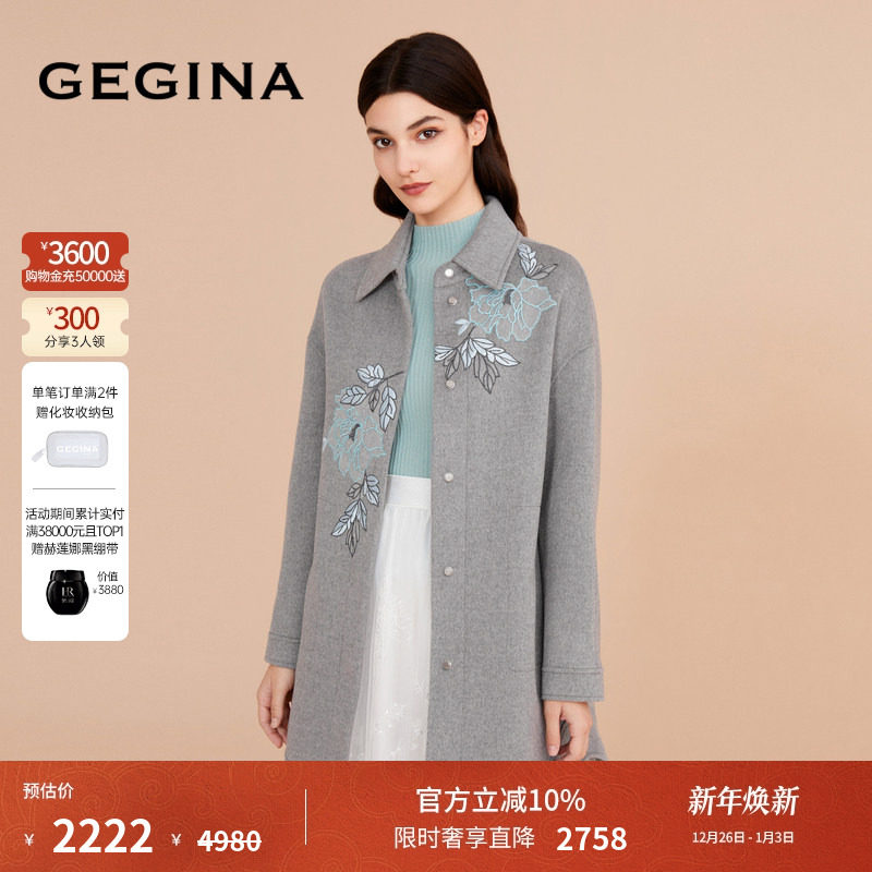 GEGINA吉吉娜新款绵羊毛羊绒混纺妮子大衣印花中长优雅毛呢外套女