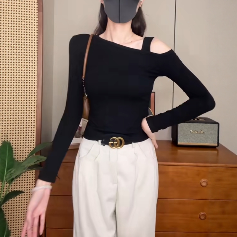 韩系设计感斜肩长袖T恤女春秋2024新款修身显瘦辣妹一字露肩上衣
