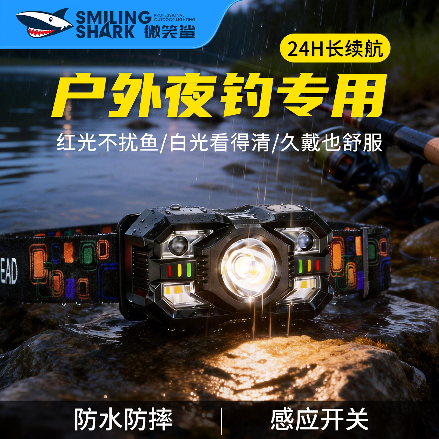 微笑鲨2026新款头灯强光超亮充电户外矿灯钓鱼专用夜钓灯头戴式