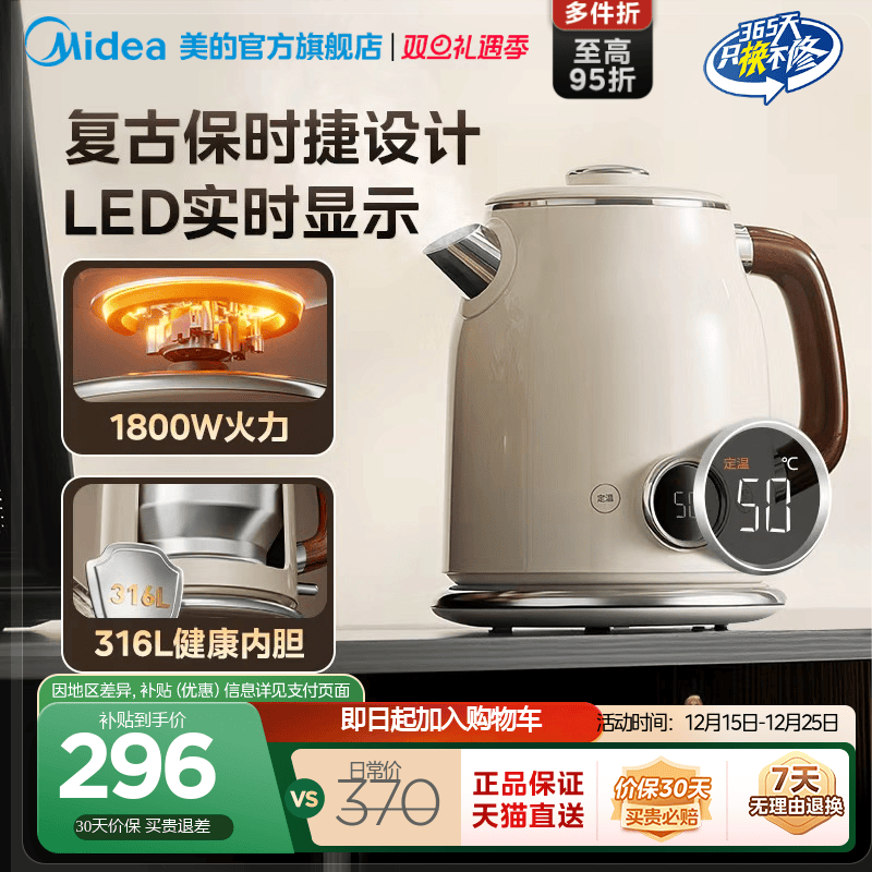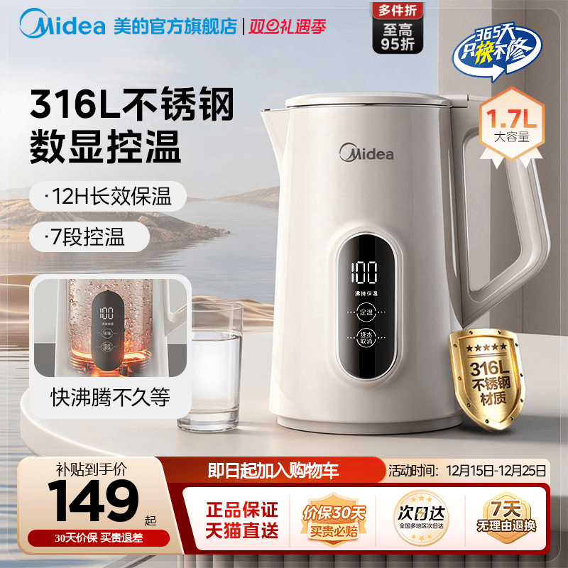 美的电热水壶烧水壶恒温一键保温双层防烫家用316L不锈钢热水壶