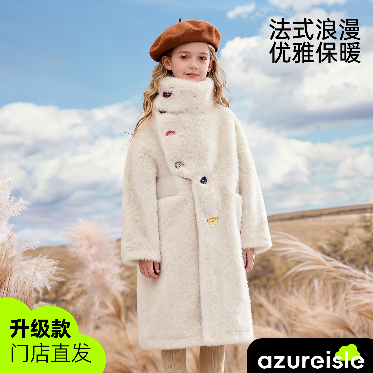 女童冬季外套2025仿水貂毛童装宽松加厚牛角扣中长款儿童皮草大衣