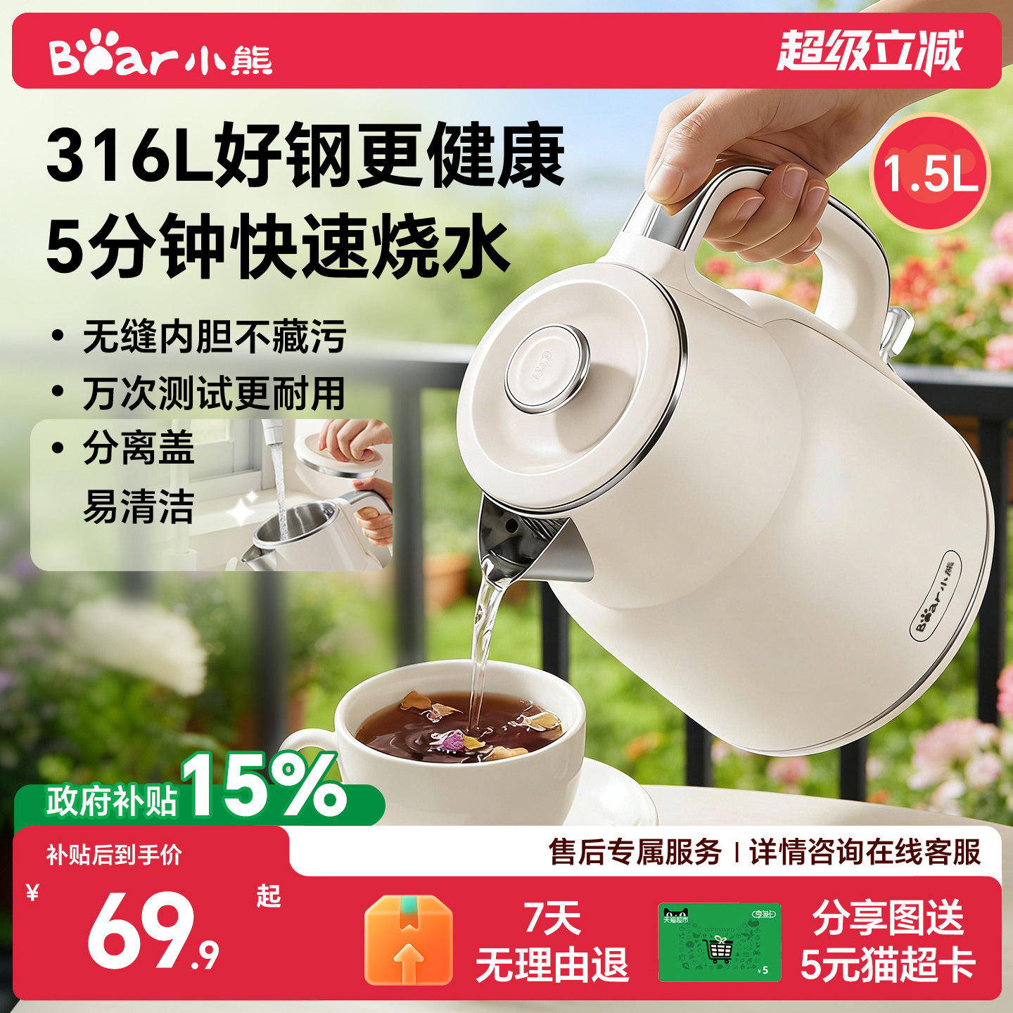 小熊烧水壶家用保温一体电热水壶新款316L不锈钢恒温大容量热水壶