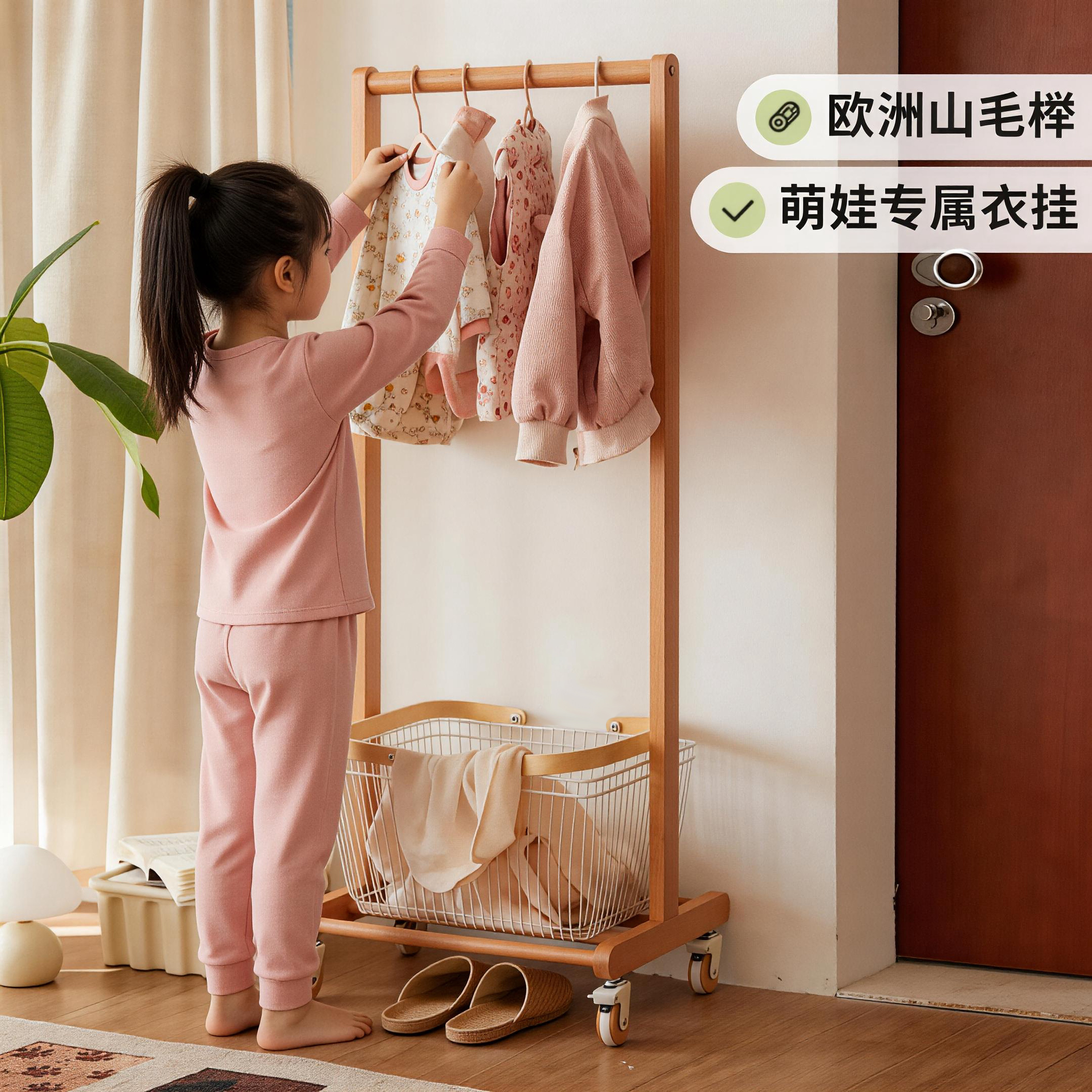 实木儿童衣帽架卧室落地挂衣架家用现代简约次净衣架小型晾衣架子