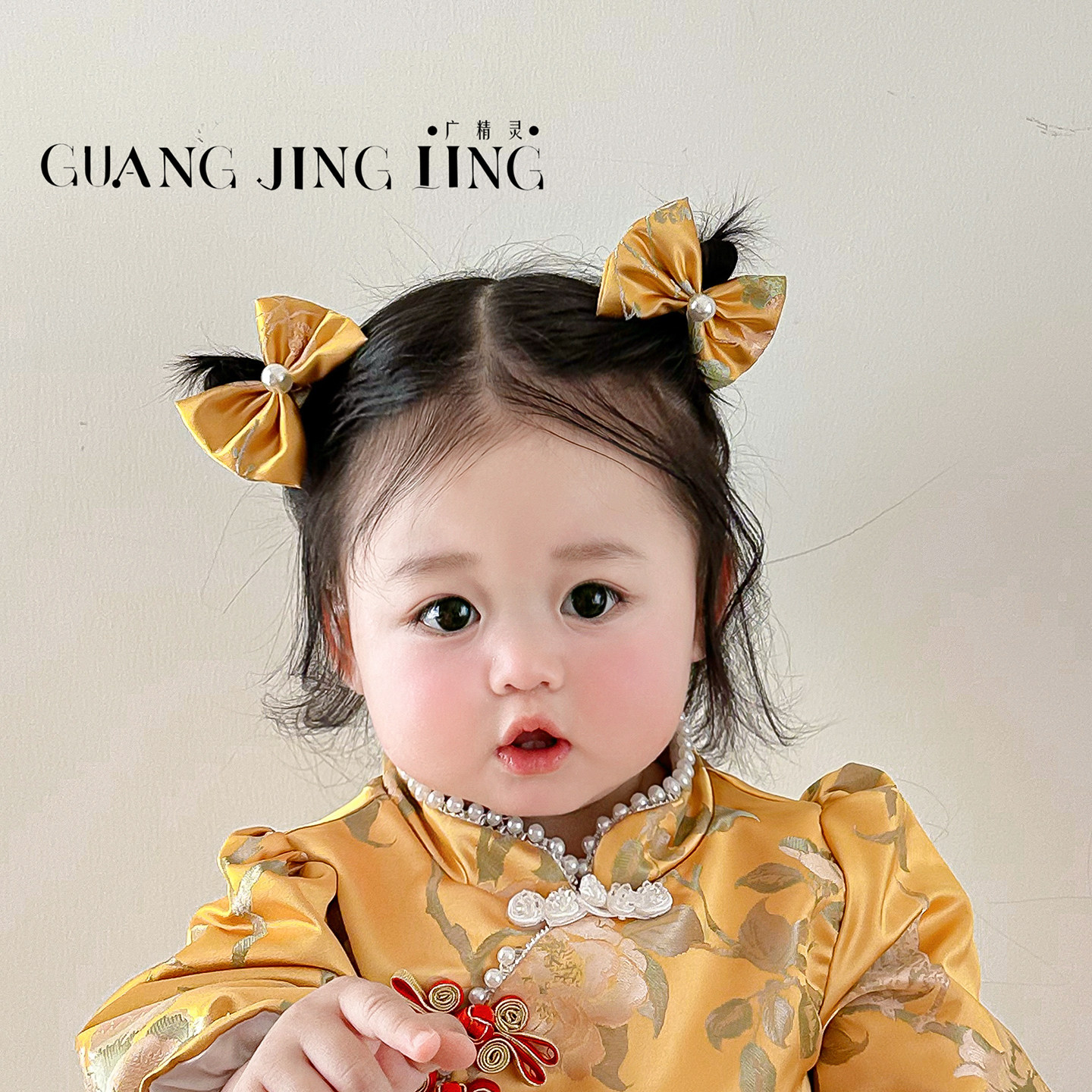 新中式小女孩黄色蝴蝶结头饰宝宝周岁抓周唐装礼服小发夹拍照配饰