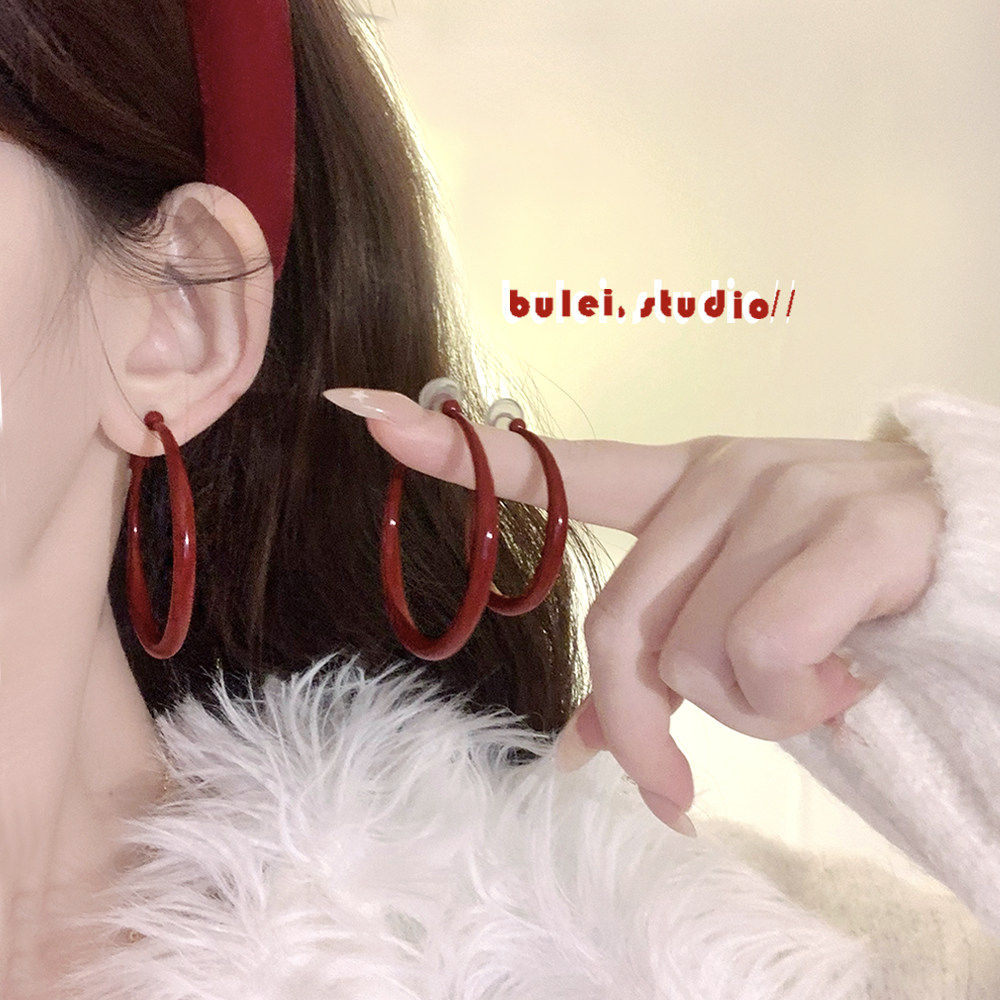 999纯银耳针耳环圈圈大圈秋冬红色耳饰女耳圈高级感轻奢素圈耳夹