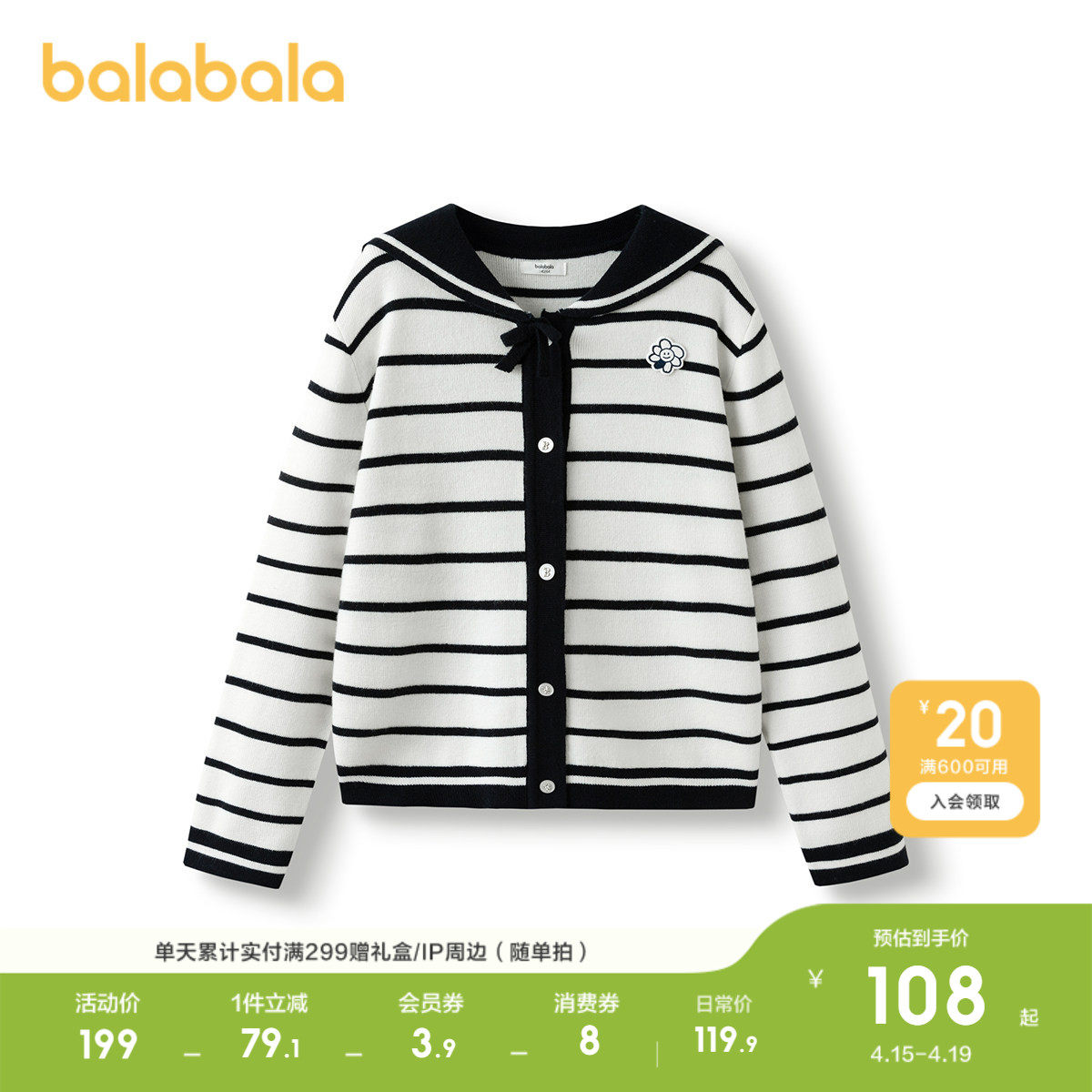 巴拉巴拉童装女童毛衣2026款春秋装儿童针织开衫蝴蝶结百搭毛衫潮