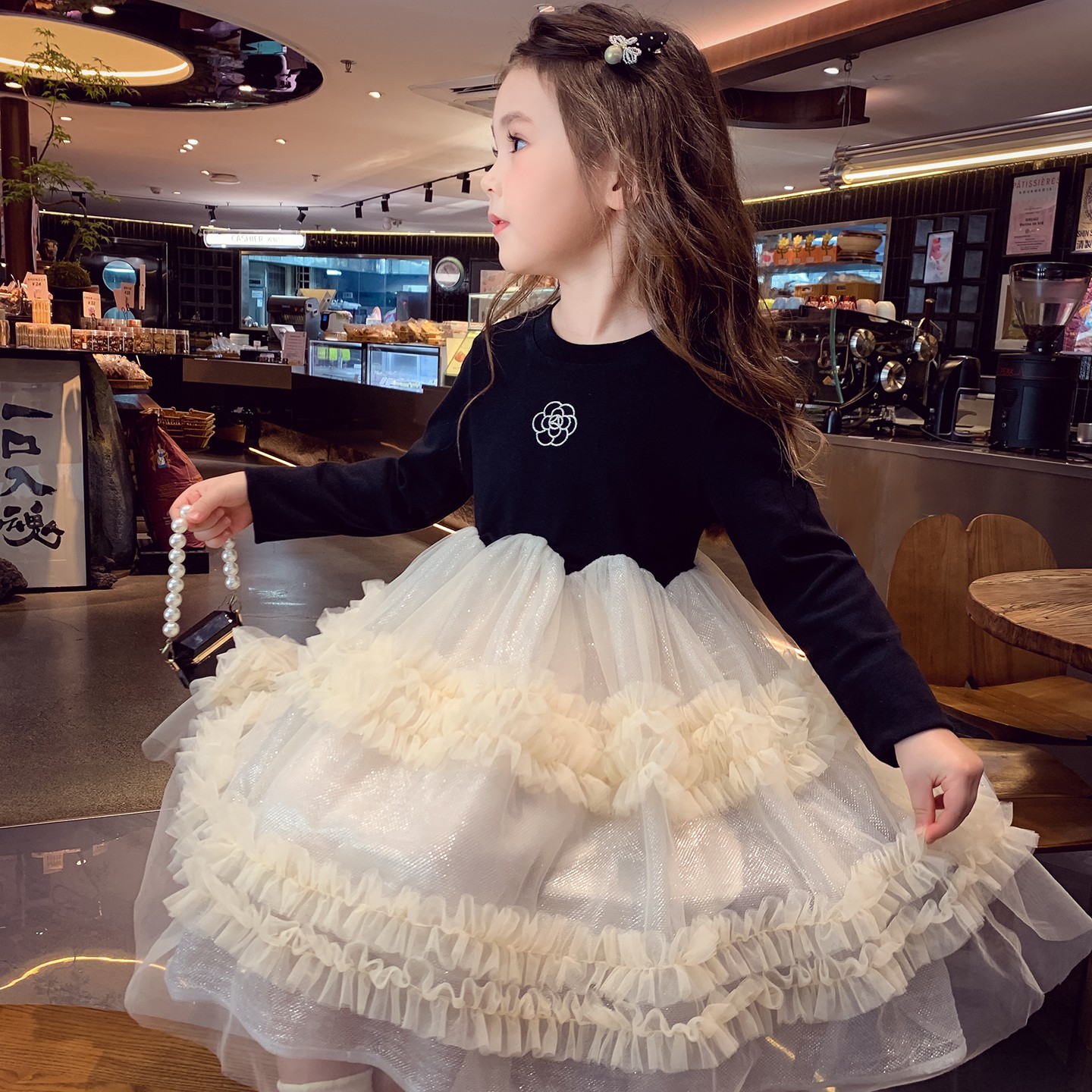 女童长袖连衣裙春秋季2025新款网纱拼接打底女孩蓬蓬蛋糕公主裙子