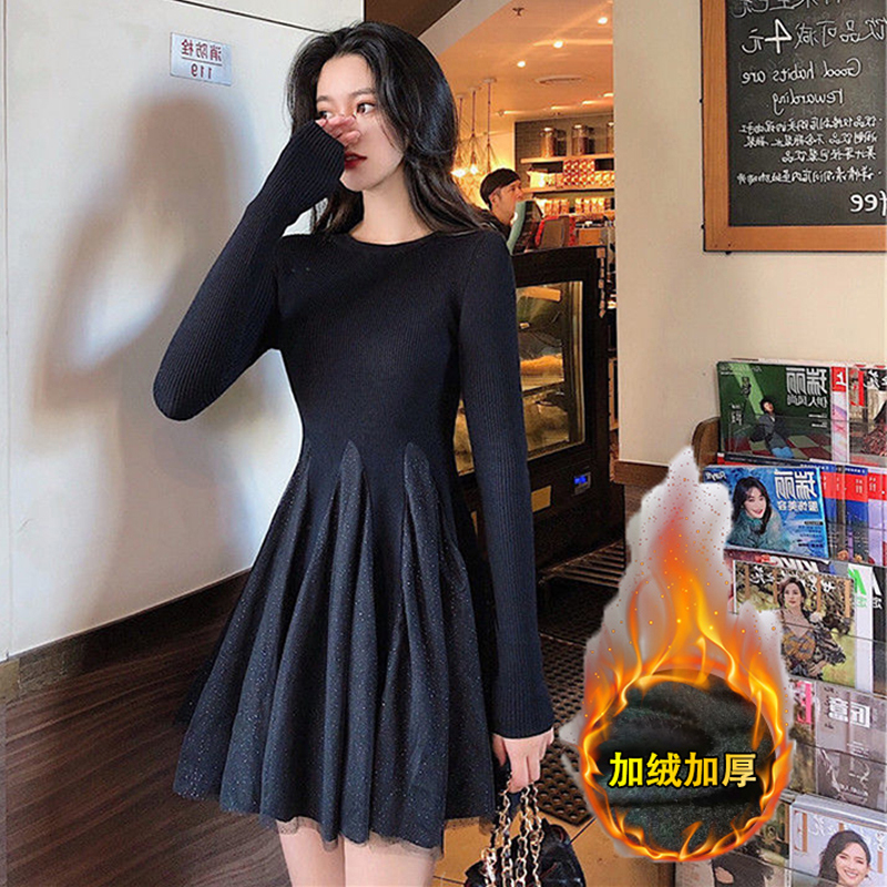 亮片网纱拼接加绒连衣裙秋冬2024新款气质女装长袖性感收腰打底裙