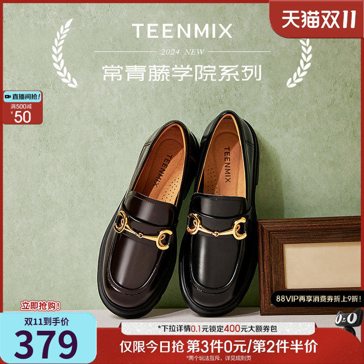 天美意平底英伦学院乐福鞋女复古单鞋休闲皮鞋新款COY24CA4