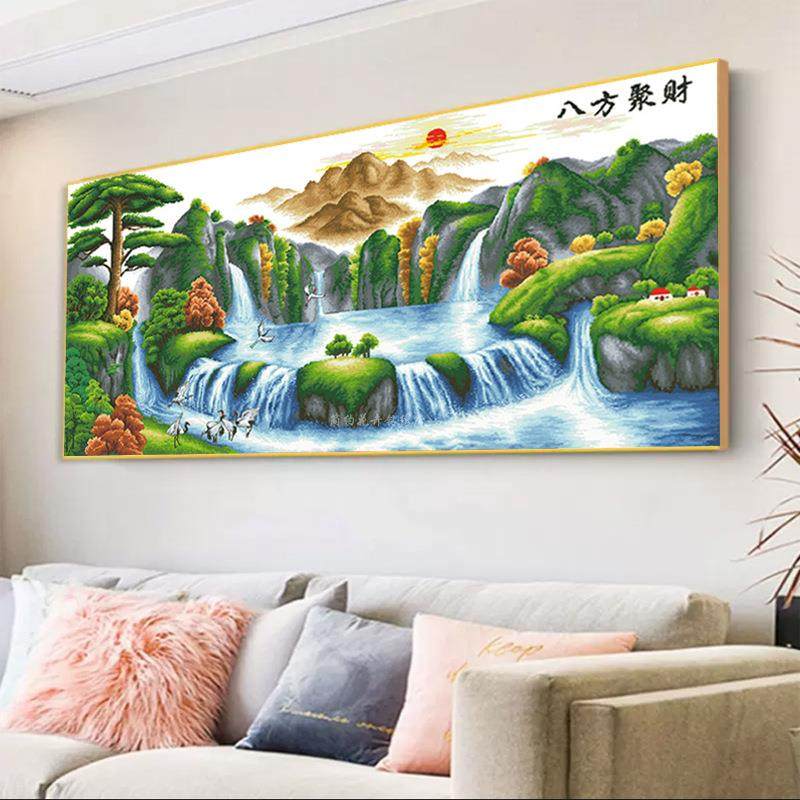 迎客松钻石画2024新款风景画大幅八方聚财点粘贴钻十字绣流水生财