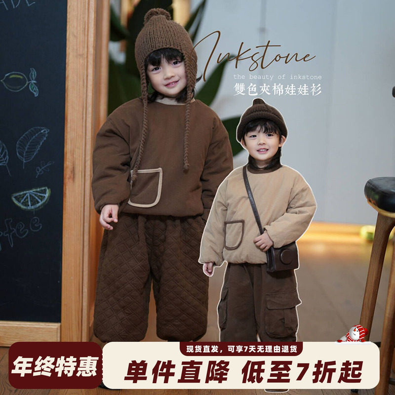 儿童绗棉连帽套头棉服棉裤两件套冬季新品男女宝宝保暖夹棉套装潮