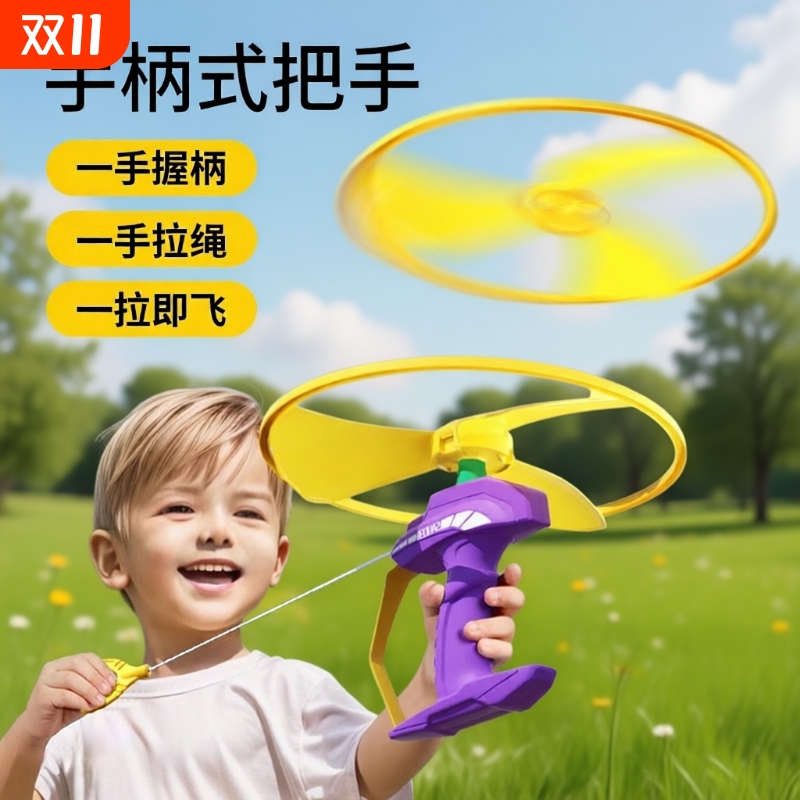 手拉飞盘飞天竹蜻蜓拉线旋转发射飞碟男孩女亲子互动儿童户外玩具