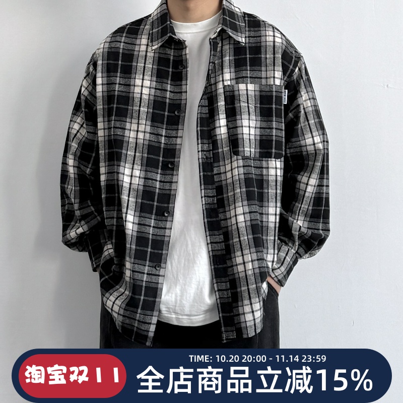 美式复古长袖格子衬衫日系潮牌男女宽松百搭街头黑白格纹衬衣外套