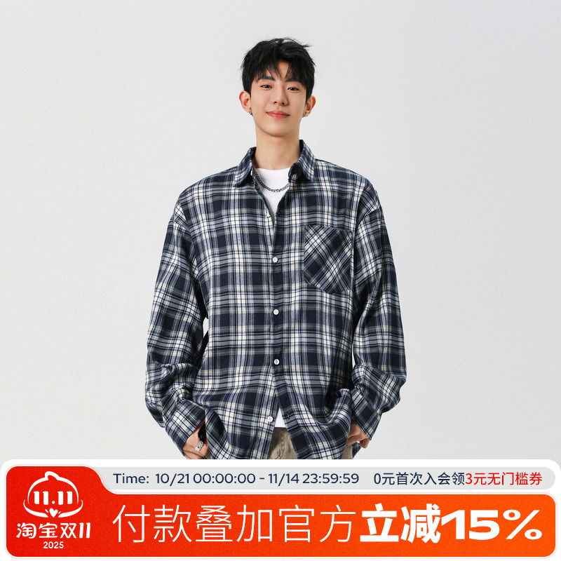 LIVELARGE秋季情侣男女宽松街头国潮CITYBOY复古黑白格子长袖衬衫