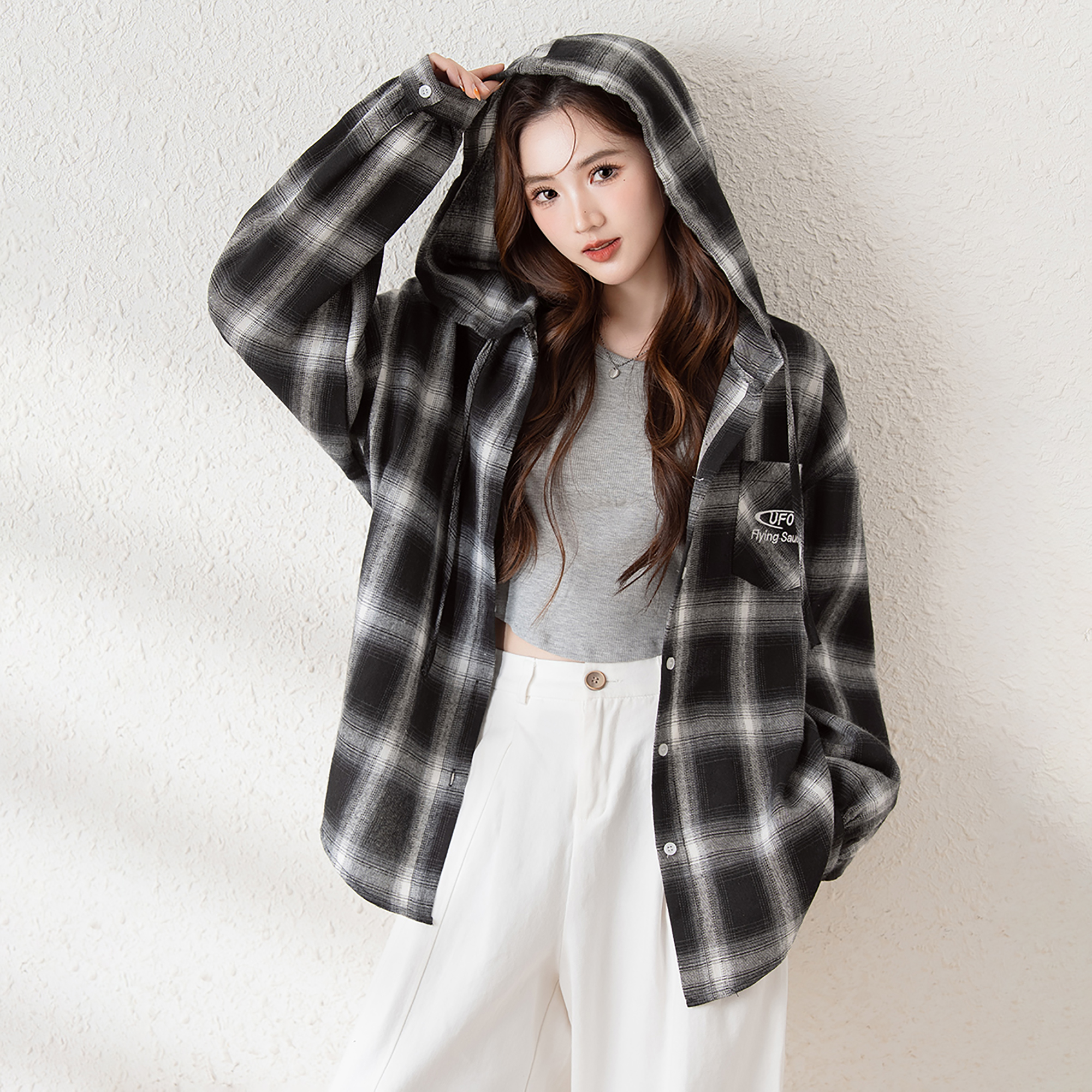 WASSUP黑白格子连帽长袖衬衫男女春秋季新款宽松休闲复古衬衣外套