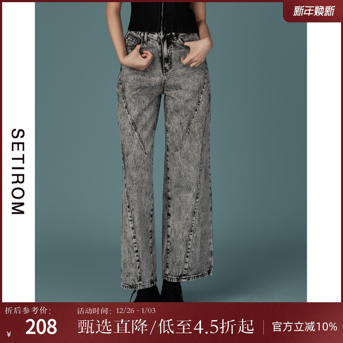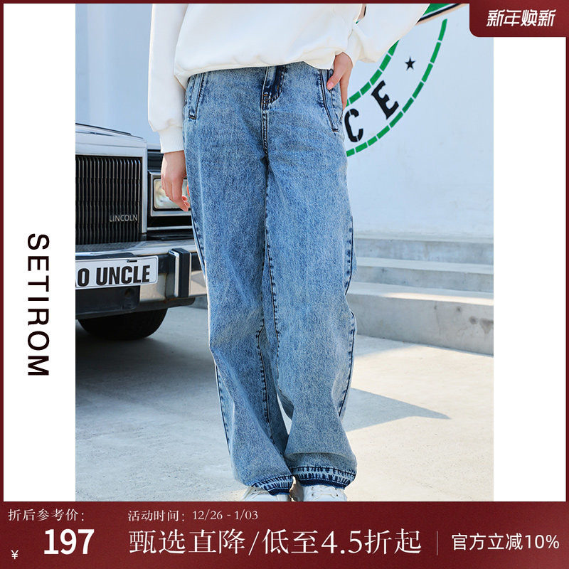 西町村屋休闲宽松直筒裤女春装新款复古水洗拼接牛仔裤AA9302003