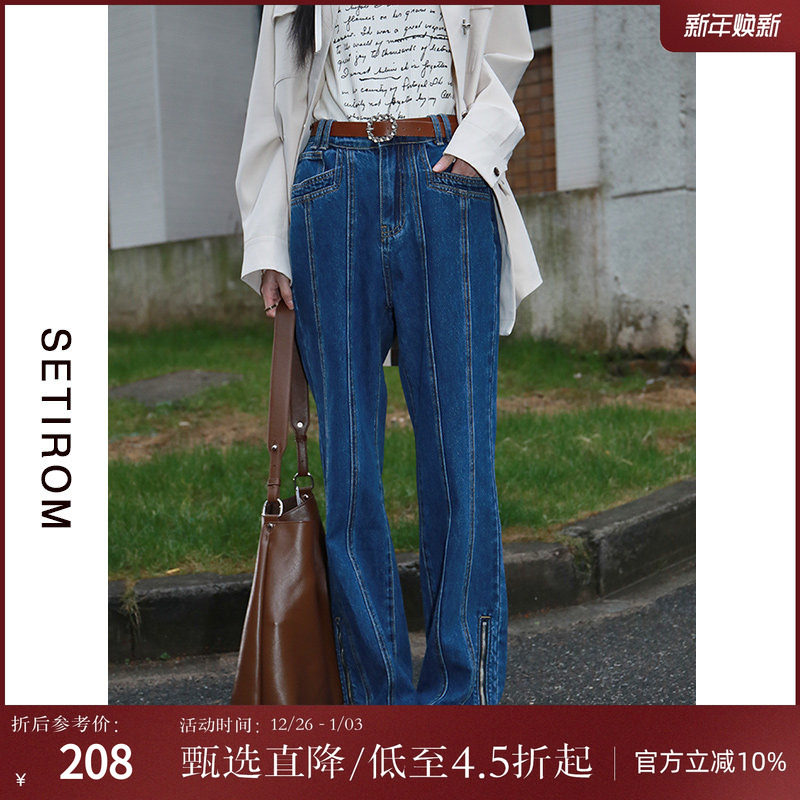 西町村屋牛仔裤女百搭轻潮设计裤子解构分割开衩微喇裤AA8308154