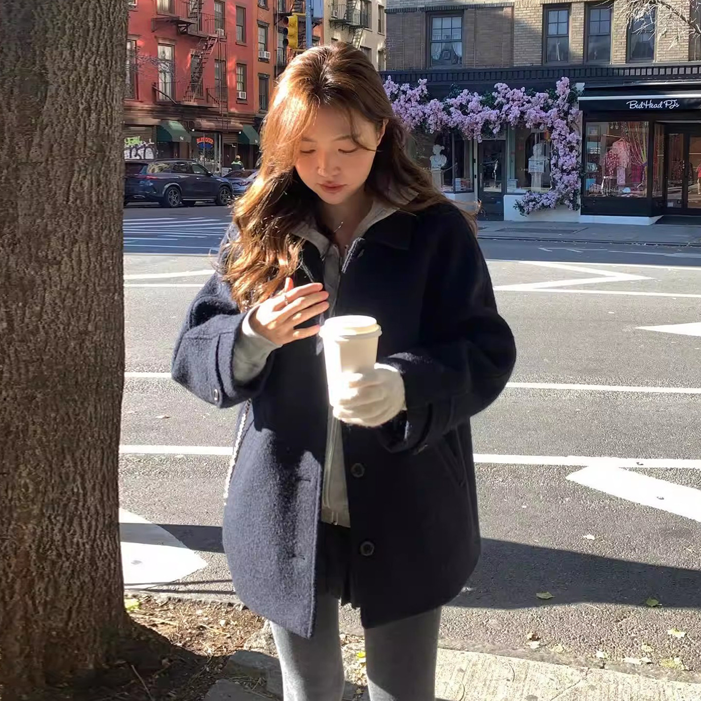 韩国chic冬季法式高级感海军领宽松休闲中长款长袖呢子大衣外套女