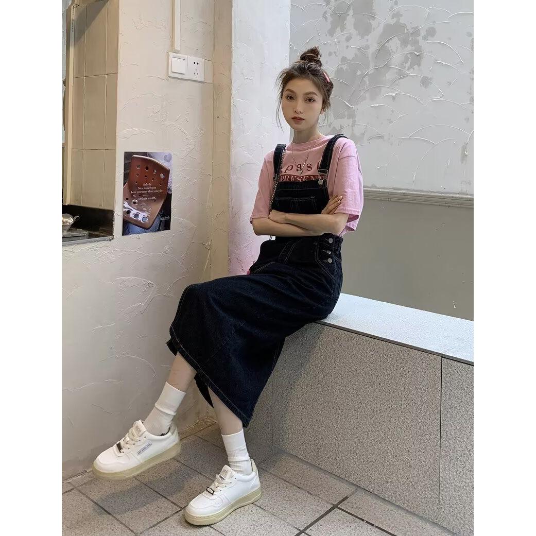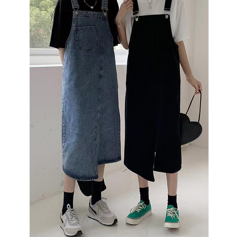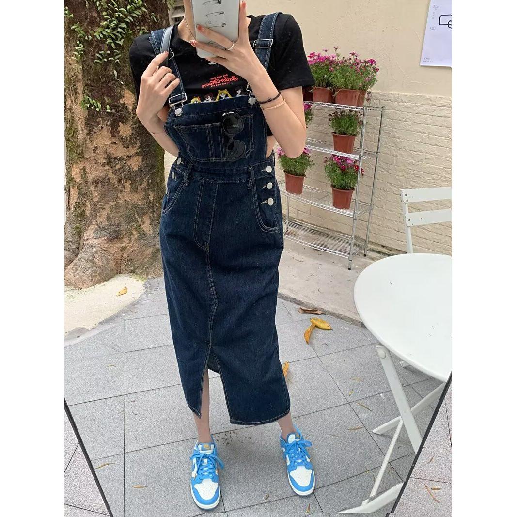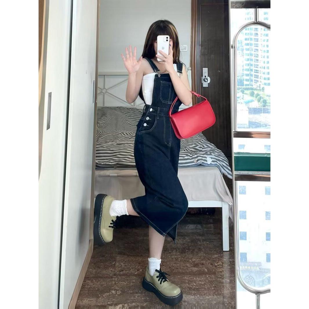 2025中长裙新款前开叉百搭宽松收腰背带裙牛仔吊带a字连衣裙潮裙