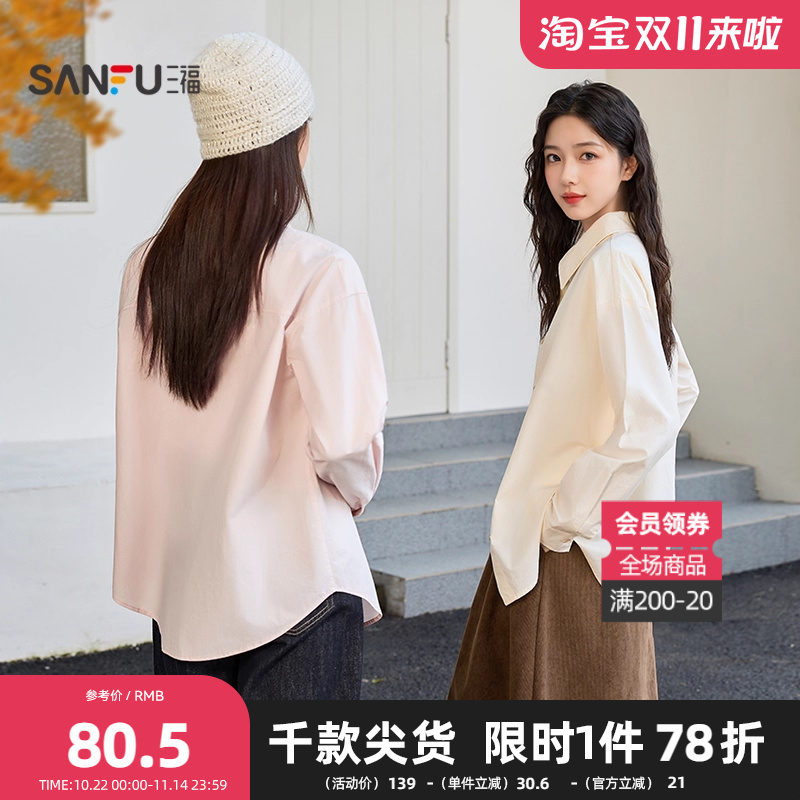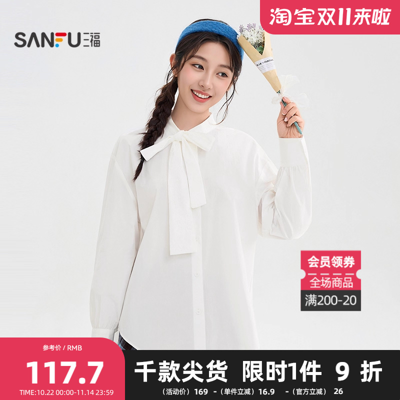 三福长衬衫2025秋季蝴蝶结图案绣花宽松翻领上衣女装504974
