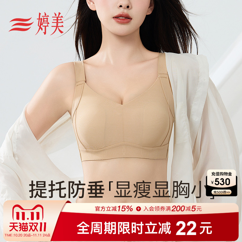 婷美新款大胸显小无痕内衣女薄款全包兔耳杯文胸收副乳调整型胸罩