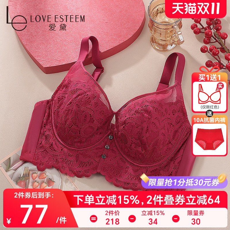 爱黛大胸薄款内衣女性感蕾丝软钢圈上托调整收副乳本命年红色文胸