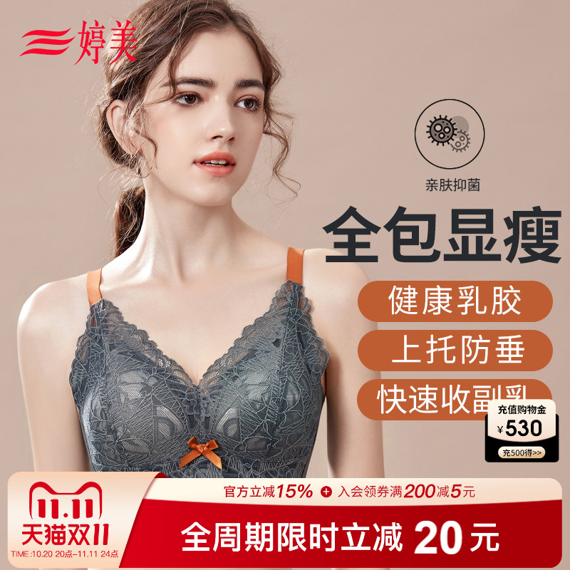 婷美乳胶大胸薄款内衣蕾丝全包容防下垂收副乳胸罩舒适无钢圈文胸
