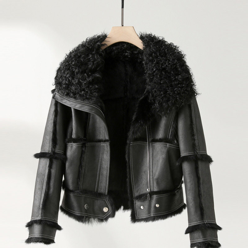 2024秋冬新品皮毛一体女年轻款羊羔毛兔毛皮草外套短款显瘦机车款