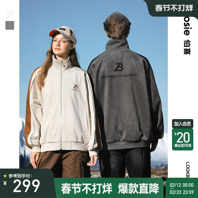 bosie伯喜2026年春季新款仿鹿皮绒夹克男情侣条纹拼接休闲外套潮
