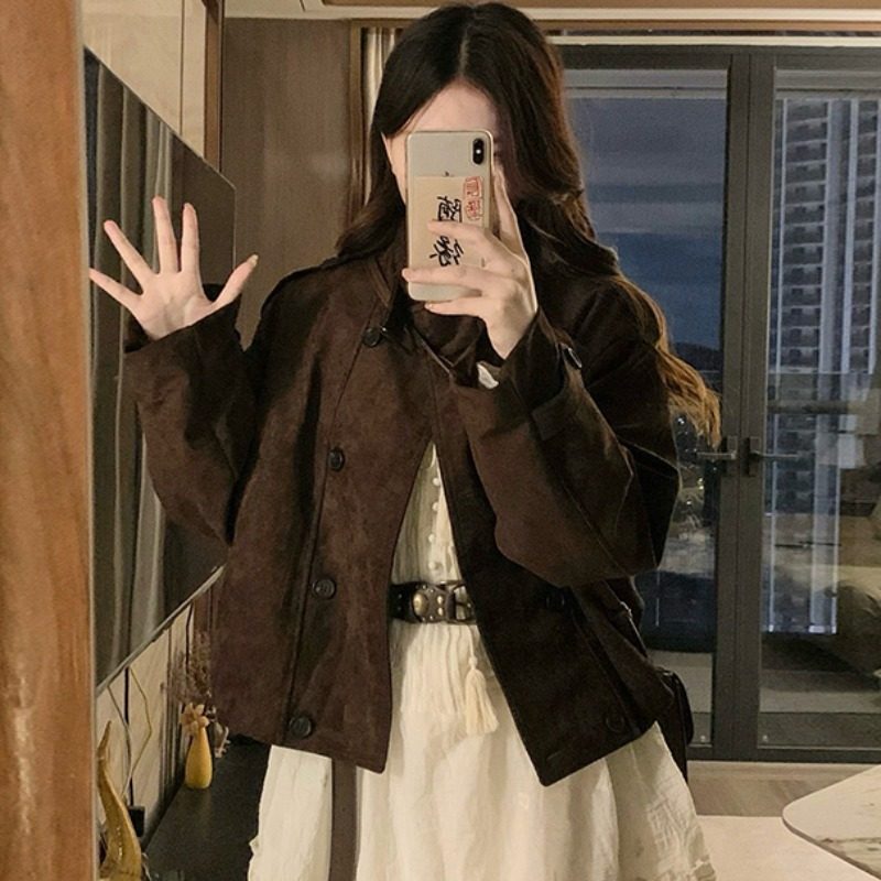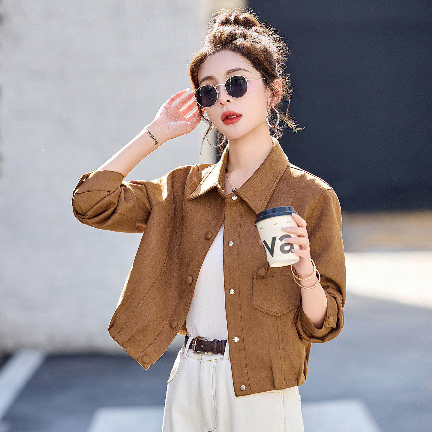 宋佳同款鹿皮绒短款外套女2025春秋新款宽松休闲廓形翻领复古夹克